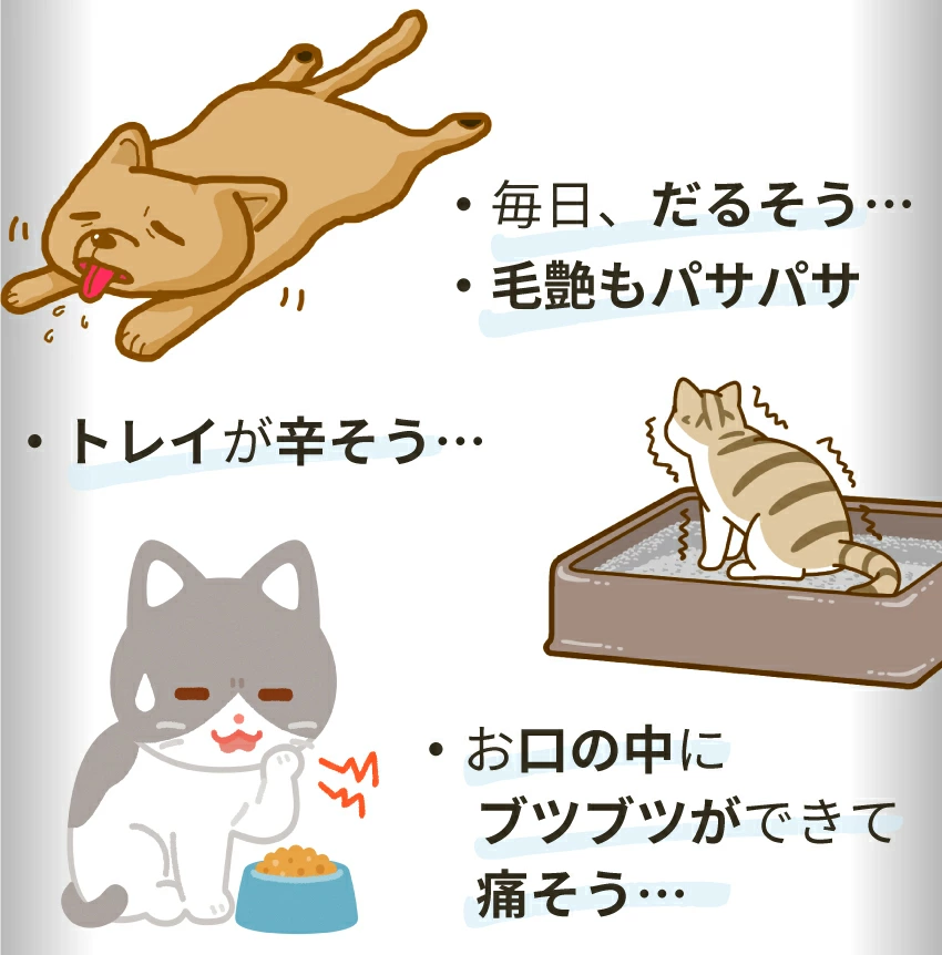 主な症状としては、食欲不振、嘔吐、下痢、極度の疲れ、脱水症状などがあります。腎臓は体内の老廃物を排出する役割を果たしているため、その機能が低下すると、体内に毒素が蓄積し、これらの症状が現れます。