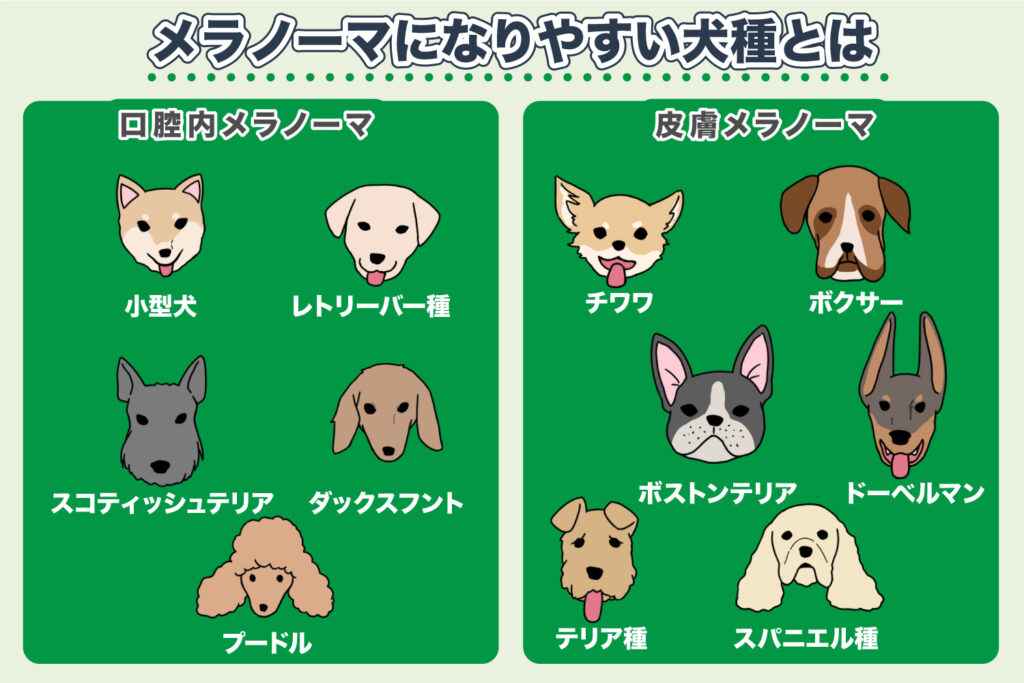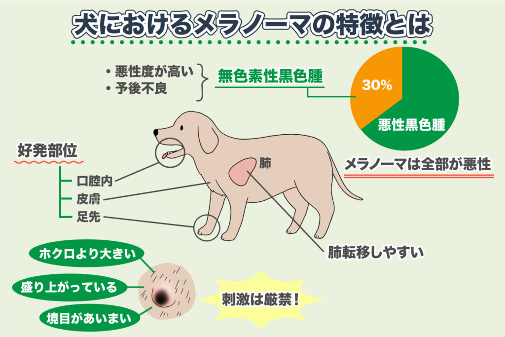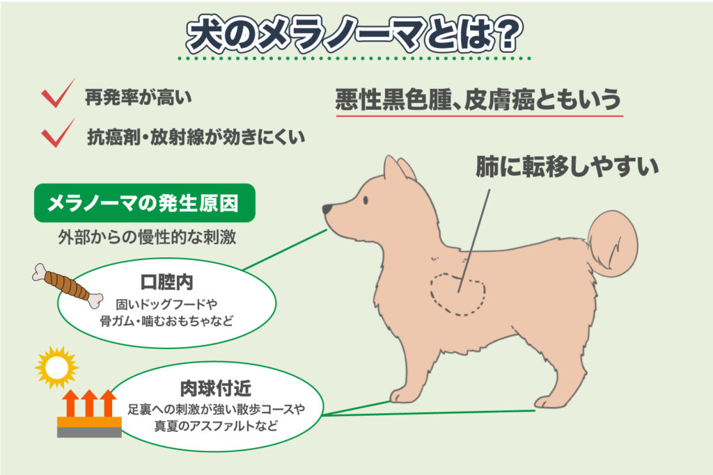 黒色の外観が特徴で、特に口腔内に発生する頻度が高く、犬の口腔内悪性腫瘍の代表例です。