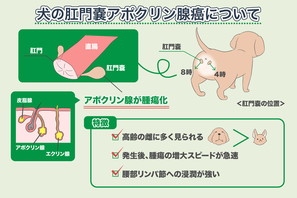 犬のアポクリン腺癌は、肛門周囲に発生する悪性腫瘍で、進行が速く、転移しやすいため、早期発見と治療が重要です。